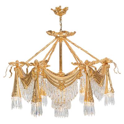 - Đèn chùm hợp kim mạ vàng hoặc mạ chrome với đường nét thanh mảnh.